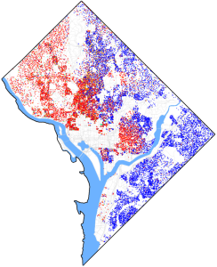 Le type de ségrégation moderne le plus facilement observable est la fragmentation spatiale. Prenons le cas de la capitale du pays: Washington, DC. Sa population est composée à plus de 47% d’afro-américains, un pourcentage plus important que celui d’habitants blancs. Pourtant, comme le révèle la carte de la répartition des populations dans la ville, ce sont eux qui résident dans les quartiers aisés du Nord-Ouest de la capitale. Les habitants noirs, quant à eux, sont repoussés vers les périphéries et les quartiers les moins aisés, notamment au Sud de la rivière Anacostia. De plus, la gentrification graduelle des quartiers excentrés de la ville ne fait qu’accentuer le repoussement des populations noires sous l’effet de la hausse des loyers… Il existe donc toujours aujourd’hui une ségrégation géographique aux États-Unis.